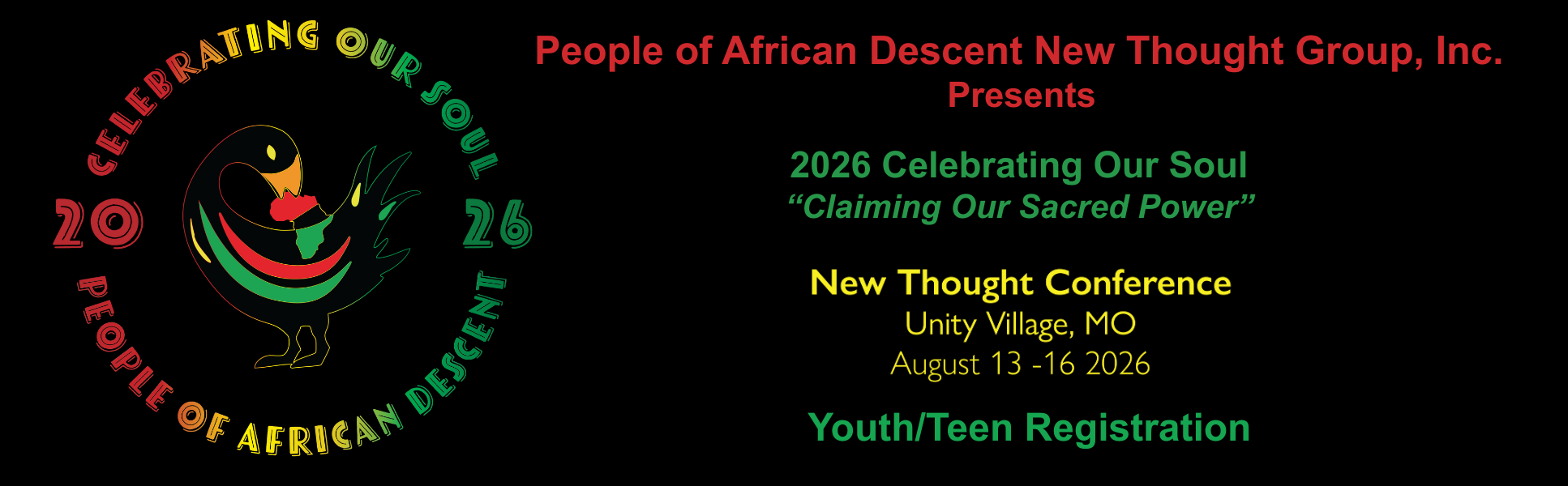 We invite you to register your Youth/Teen (ages 8 - 18) to attend the Celebrating Our Soul Conference by the People of African Descent New Thought Group, Inc. This premier event is on Thursday, August 13 - Sunday, August 16, 2026, located on the beautiful grounds of Unity Village, MO.